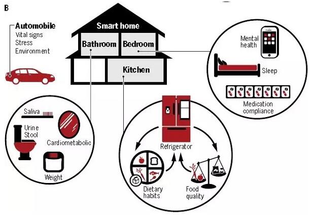 未来数字智能家居为我们描绘了一幅这样的画面(图三):早上起来照一下镜子,其内置的雷达可以扫描我们的各项体征;刷牙时牙刷会对我们的唾液自动进行生物分析;智能马桶可以针对性的检测我们的粪便和尿液中的疾病标志物;开车时,车载监测可以通过我们的日常对话和驾驶行为来判断我们是否压力过大,或者疲劳驾驶,甚至可以通过酒精分析来避免酒后驾驶;通过使用手机的规律、发送信息的增减来判断是否存在抑郁或焦虑,及时建议心理医疗的介入;晚上躺在床上可以实时监测我们的心肺功能。以上种种如科幻小说中的情节,并非遥不可及。数字镜子产品Wize Mirror已经整合了大量的感应器和摄像头在内,分析图像判断体重,是否有压力大的信号,皮肤光谱分析检测胆固醇的水平,气体感应器用来分析呼吸中的酒精或是否吸烟。TOTO的智能马桶可以收集尿液来检测糖水平,帮助判断糖尿病。