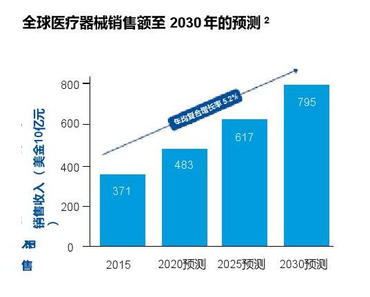 医疗器械行业有望保持稳定增长,全球年度销售额预测以每年超过5%的速度增长,到2030年销售额将达到近8000亿美元。 这些预测反映了人们随着现代生活习惯病日益普遍,对创新型新设备(如可穿戴设备)和服务(如健康数据)的需求持续增长,以及新兴市场(尤其是中国和印度市场)的经济发展释放了的巨大潜能。