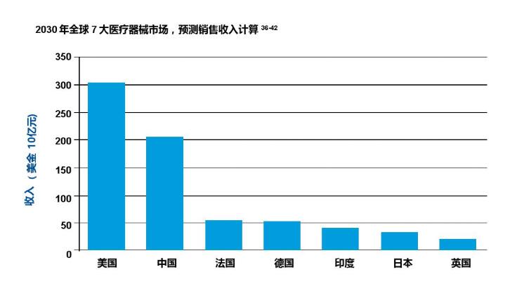 美国在2030年将继续主导医疗器械行业,销售将超过美金3,000亿元,但前五大市场还将包括中国(排名第二位, 占全球市场份额超过25%,收入将超过美金2,000亿元32)和印度(排名第五, 收入将超过400亿美元33)。受医疗改革、地方政府的激励措施和对医疗的总体需求增长的推动3435,中国和印度的增长速度已经是整体市场的两倍。这两个国家也在快速地发展成为创新中心——印度已经被誉为廉价工程技术的全球中心, 制造了许多具有全球市场潜力的本土(和低成本)器械。